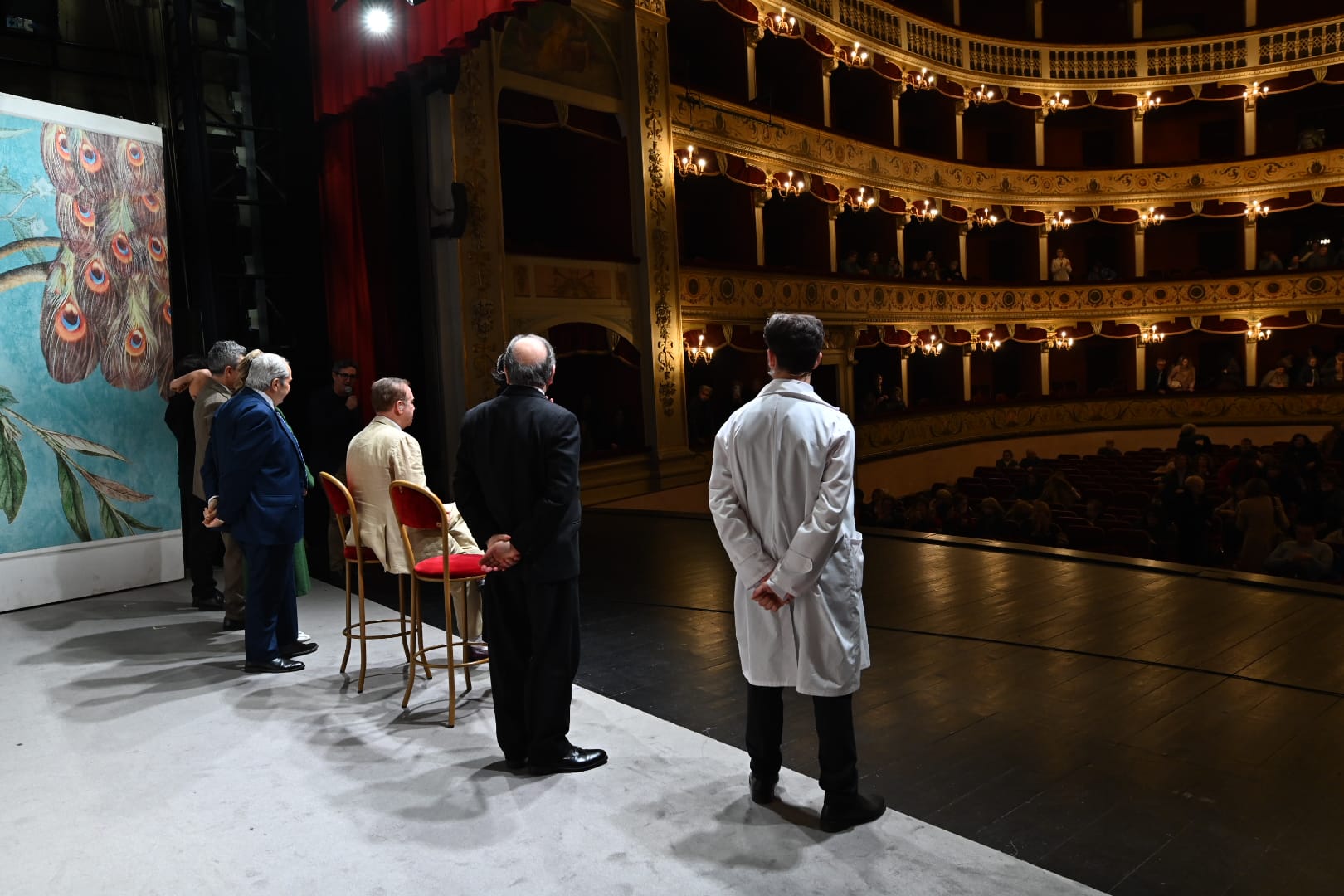 Da un’idea del direttore artistico Roberta Torre, il Teatro Pirandello ha regalato al suo pubblico un momento speciale al termine della seconda replica pomeridiana de Il Vedovo. Quando gli spettatori stavano già lasciando le poltrone per far rientro a casa, il sipario si è inaspettatamente riaperto: sul palco, seduti ad attenderli, c’erano Massimo Ghini, Galatea Ranzi e l’intera compagnia dello spettacolo.